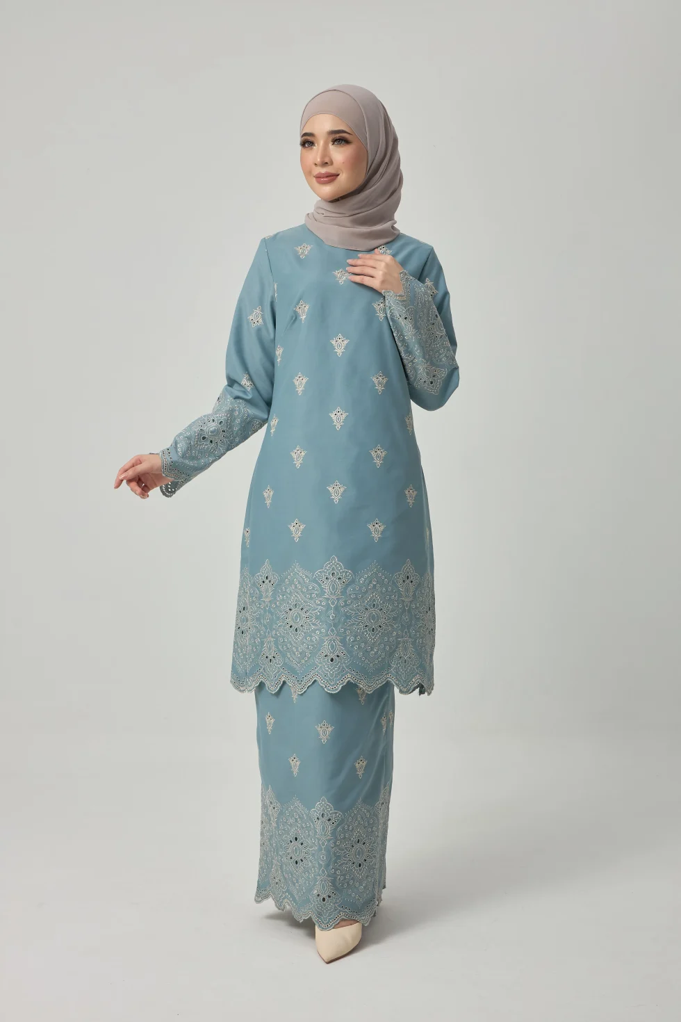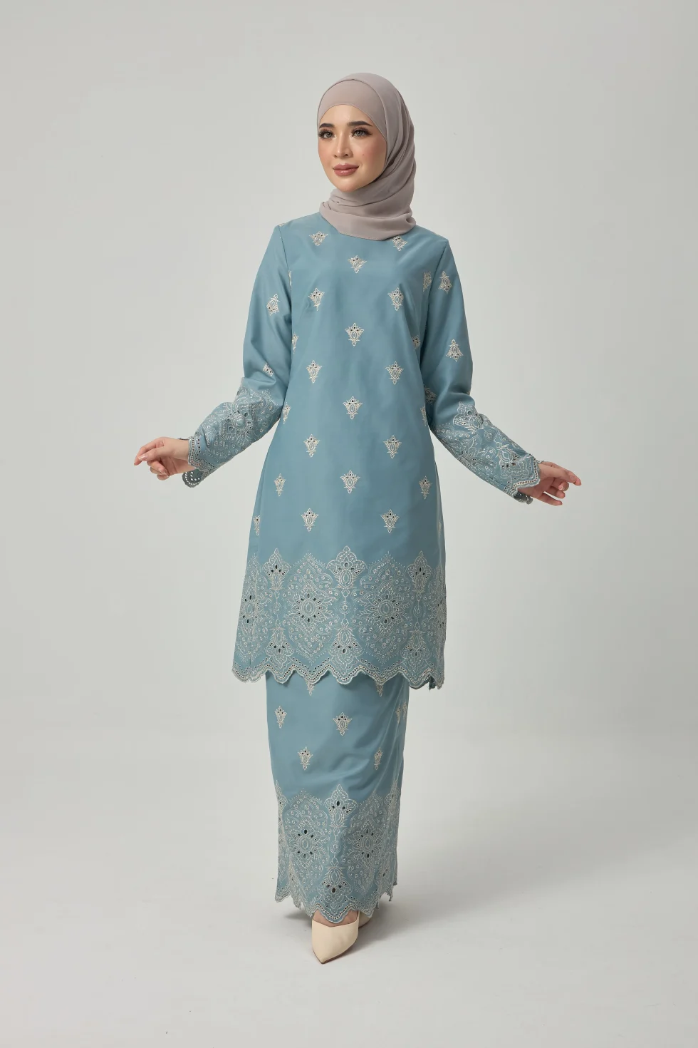 Intricate Full Embroidery: Adorned with exquisite full embroidery, this kurung boasts detailed patterns that add a touch of luxury and artistry. Each stitch tells a story of craftsmanship, creating a beautiful contrast against the fabric.